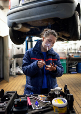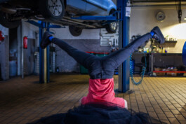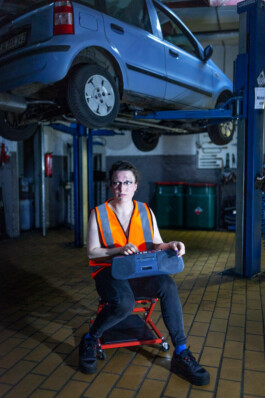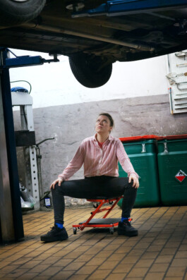 In the solo auto-fiktion: der struggle* so real, dancer and choreographer Verena Brakonier invites her audience on a journey to her childhood, to a car workshop. She dances and tells about experiences and memories. What is true and what is not remains unclear: an autofiction. Playfully and with critical humor, she shows how origins can affect the body, movements and the way through life. Between lifting platforms, tires and welding equipment, she negotiates classism, discrimination based on socio-economic origin and class position, and its influence – societal and on her personally. She explores a space between different milieus, male-dominated work environments, and so-called „high culture.“ When was the first time you went to the theater? And when to a car repair shop?